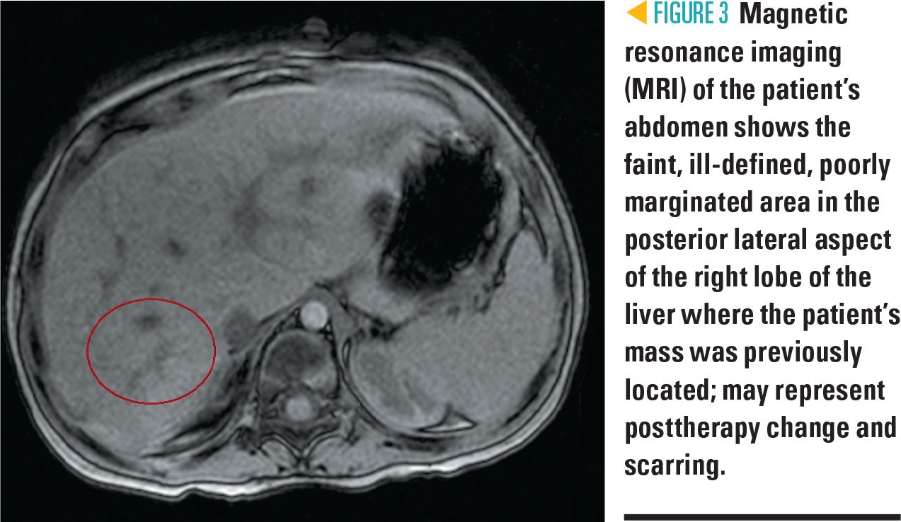 Inflammatory pseudotumor can be a manifestation of IgG4-related disease, an immune-mediated condition characterized by lymphoplasmacytic infiltration with a predominance of immunoglobulin G4-positive plasma cells, frequent elevation of serum IgG4, and a dramatic response to glucocorticoids, if administered.6,7 Initially, this patient had elevated serum IgG4 levels, which normalized over time, and liver pathology was positive for IgG4 plasma cells. Given these laboratory and pathology findings, the patient’s IPT appears to be consistent with the lymphoplasmacytic subtype. Although glucocorticoids are found to be effective, this patient did not receive steroids because of her improved fever curve and continued hemodynamic stability throughout her hospitalization.