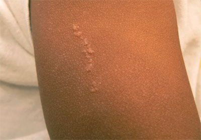 These hypopigmented, mildly pruritic lesions on the right arm of a 7-year-old African American girl appeared several weeks ago. She had no other lesions and was otherwise healthy. The diagnosis on the basis of the clinical presentation was lichen striatus.
