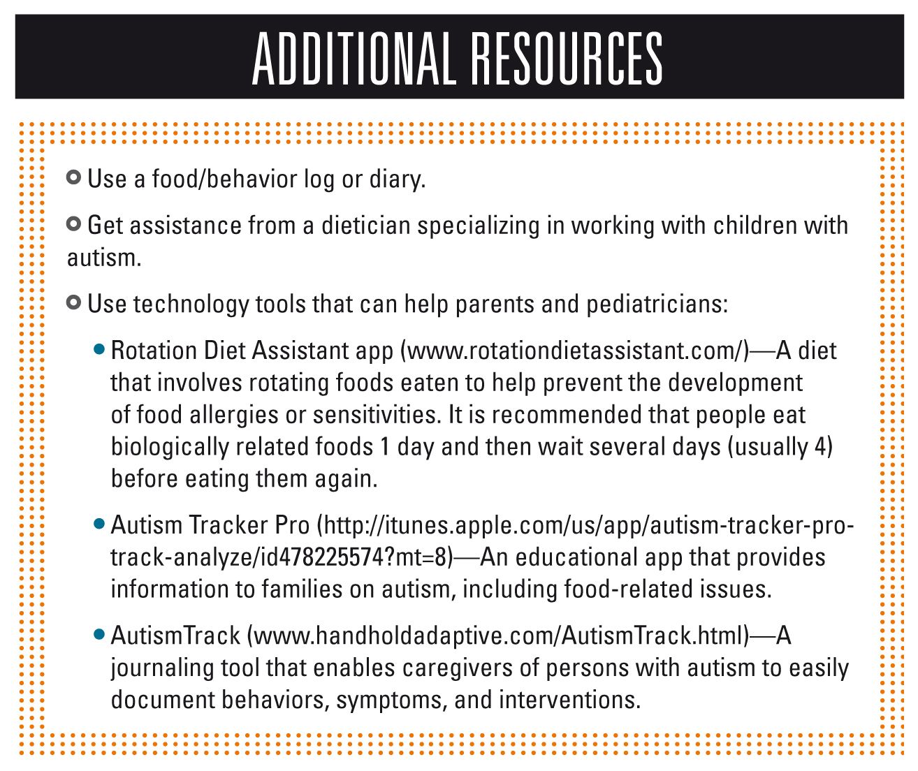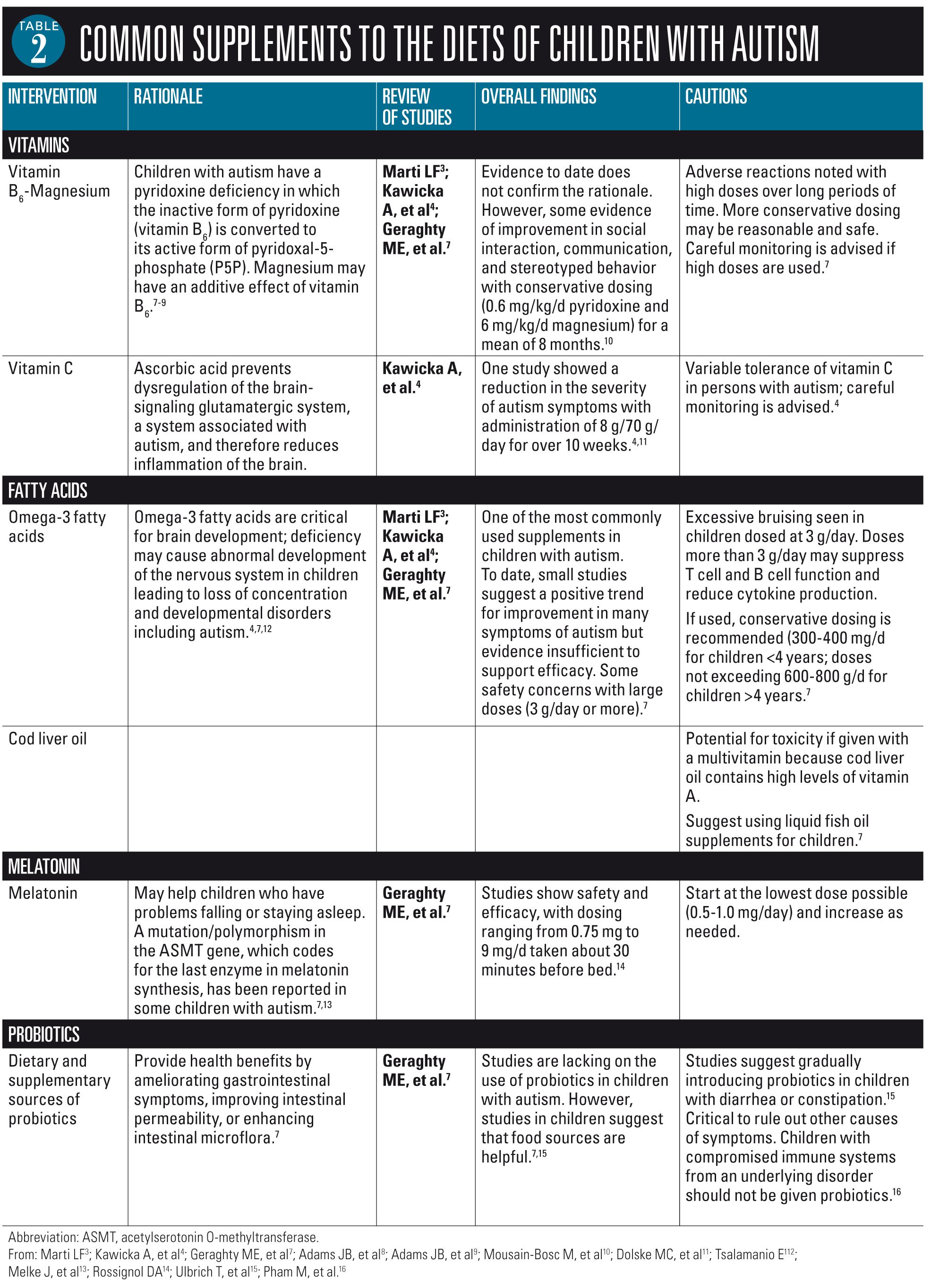 6. Geraghty ME, Depasquale GM, Lane AE. Nutritional intake and therapies in autism: a spectrum of what we know: part 1. Infant Child Adolesc Nutr. 2010;2(1):62-69. Available at: http://can.sagepub.com/content/2/1/62. Accessed March 20, 2014.