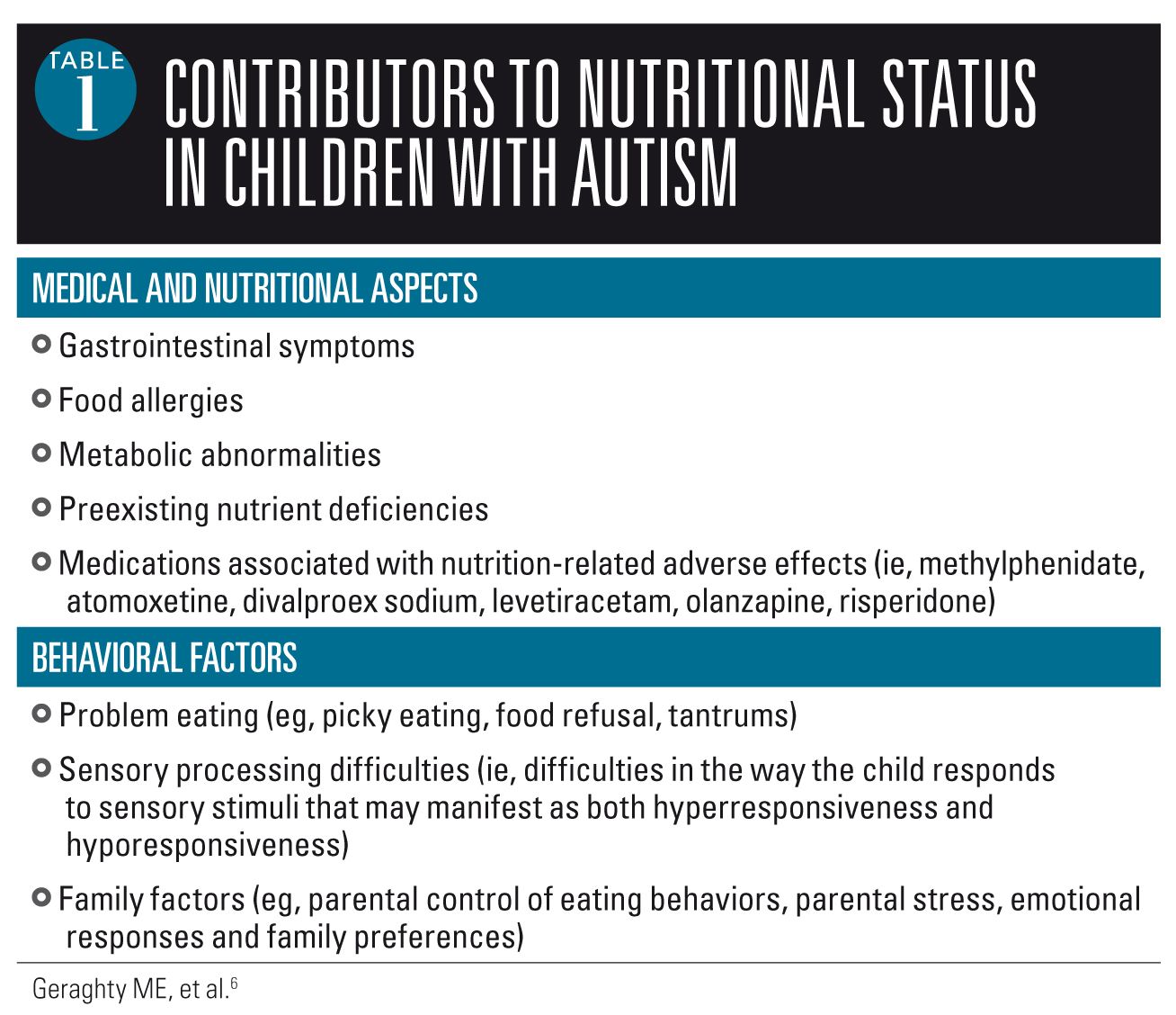 Studies are looking at the many factors that contribute to the nutritional status of children with autism, including medical and nutritional aspects and behavioral factors (Table 1).6
