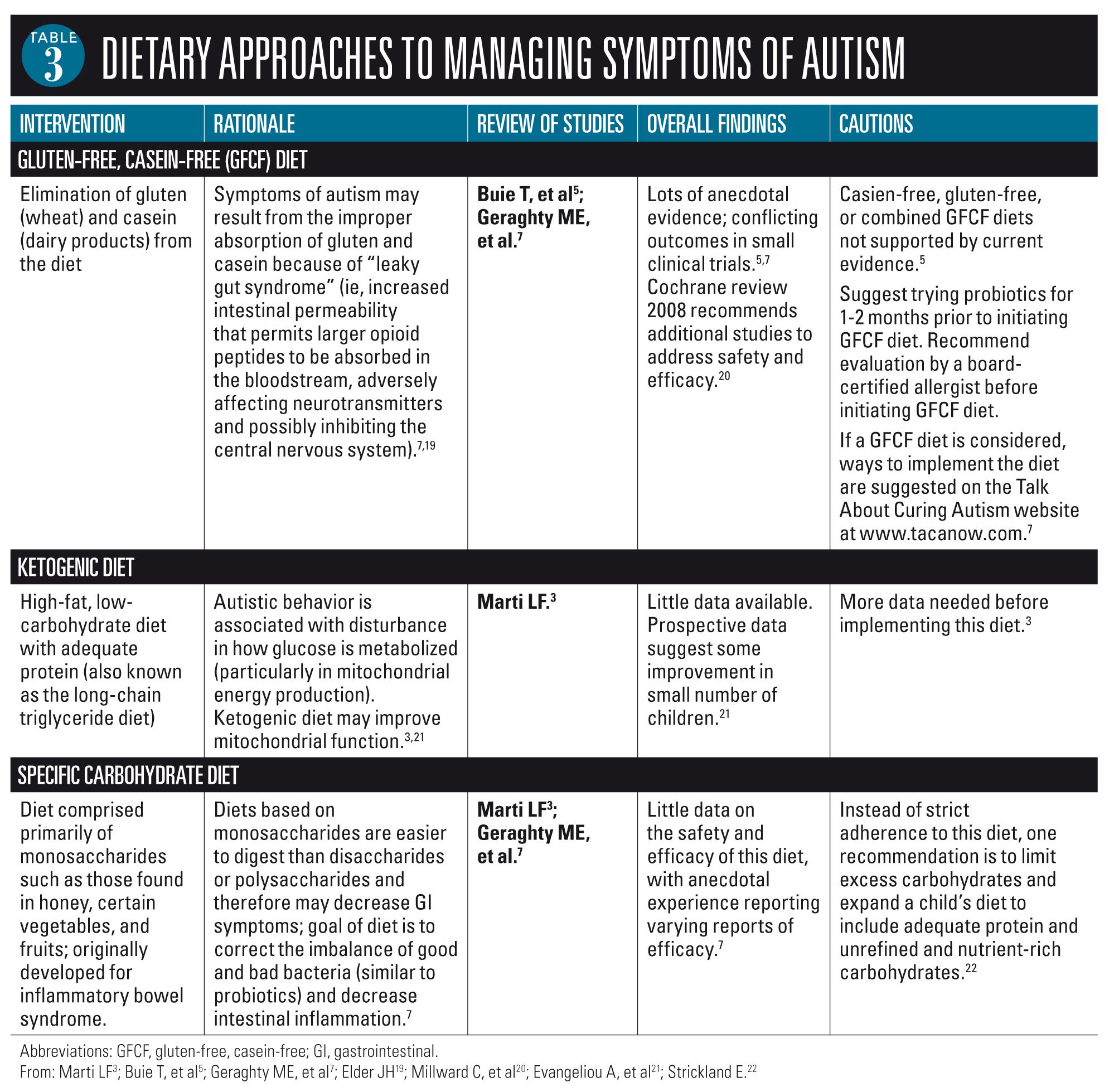 3. Marti LF. Dietary interventions in children with autism spectrum disorders-an updated review of the research evidence. Curr Clin Pharmacol. September 20, 2013. Epub ahead of print.