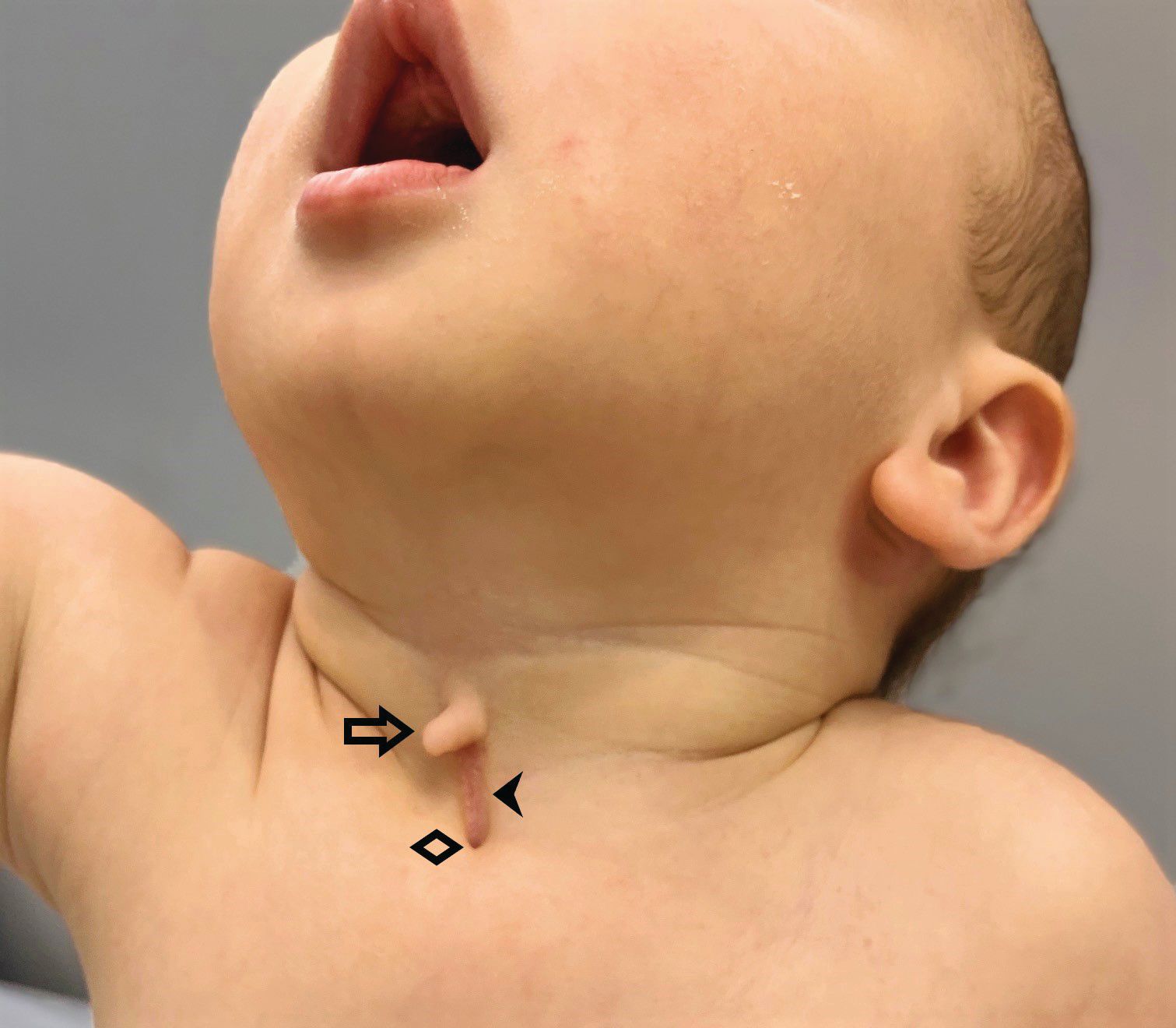 A 4-day-old boy with a midline neck lesion (Figure 1) was born at term by normal vaginal delivery. Antenatal fetal scans were normal except for the midline neck lesion. After birth, mid line lesion had the configuration of a linear cleft with a cephalocaudal orientation, extending from the level below the hyoid bone to the suprasternal notch with a length of 2.5 cm and a width of 0.5 cm (Figure 1). It was composed of 3 components: a nipplelike projection (Figure 1, black arrow), midline longitudinal sulcus (Figure 1, solid black arrowhead) and a blind sinus (Figure 1, black diamond) at the inferior end. There was a seromucinous discharge from the sinus, which was gradually reduced during few weeks of infancy. On extension of the neck, a skin web was formed between the skin lesion and the mandible (Figure 2).