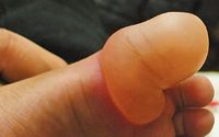 The differential diagnosis would also include accidental and nonaccidental thermal and chemical burns resulting in partial- or full-thickness skin necrosis with painful bullae, erosions, and ulcerations on an irregularly shaped red base. The distribution of the bullae-not affecting the top of the toe nor adjacent toes-makes an immersion burn an unlikely if not implausible mechanism. Painful herpetic vesicles may fuse to form large bullae, but the distinctive loculations are often visible within the bullae.