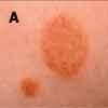 A5-year-old boy, who lives on a farm and routinely plays with his pet dogs, presented with these scaly, inflamed macules with a central clearingon the abdomen (A) and forehead.