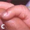 Type B ulnar polydactyly, the most common digit duplication, usually appears as a skin tag (Photo C). (There was a history of polydactyly in this newborn's family.) In type A ulnar polydactyly, the extra little finger is more well-developed and may contain bone and other finger elements. Accessory metacarpals are not generally associated with the extra digit.