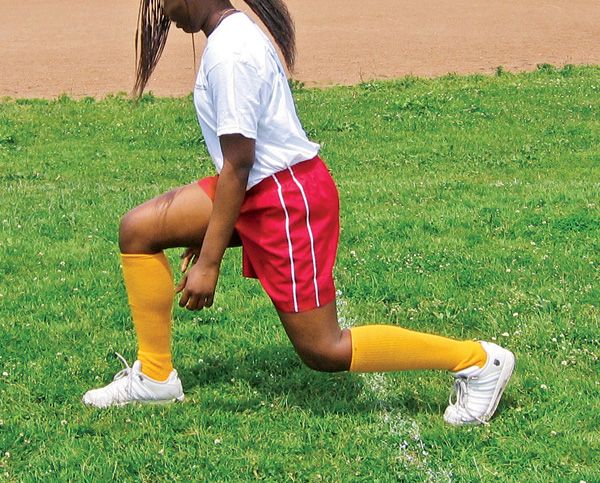 FIGURE 4 In a forward lunge, athletes step forward into a lunge and then return to standing, keeping the back straight and not allowing the knees to pass the toes. Lunges are also performed in the sagittal plane (not shown) to evenly strengthen the quadriceps, hamstrings, and gluteal muscles; improve core stability; and minimize strength imbalance between legs.