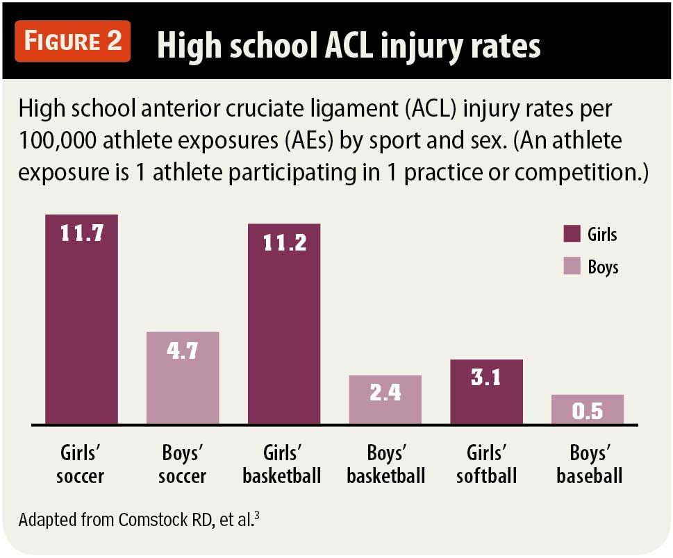 ACL injuries have both immediate and long-term consequences for young athletes. Short-term consequences include pain and disability during the treatment phase, which involves surgery and 6 to 9 months of intensive rehabilitation before return to sports is considered. Treatment costs related to surgery, therapy, and rehabilitation are substantial. Estimates from 1999 to 2000 averaged $17,000 per injury and are likely to have significantly increased since that time.5,7 Furthermore, treatment of an ACL injury can considerably affect an athlete’s academic performance. For example, 36% of athletes in 6th to 12th grades undergoing surgery during the school year were noted to fail an examination upon return to school, compared with 0% of those undergoing surgery during a holiday or summer break.8 The potential consequences of an ACL injury may be more pronounced for girls than for boys. A study of high school athletes found that compared with boys in similar sports, girls were more likely to have surgery and less likely to return to sports after an ACL injury.9