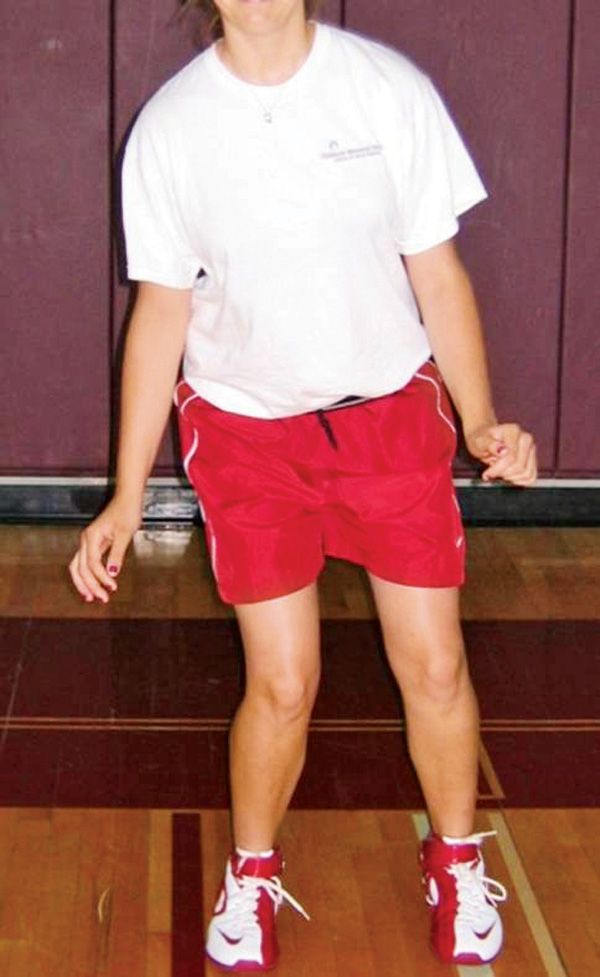 FIGURE 1 Female athlete landing from a jump with the right leg in dynamic knee valgus-hip internally rotated and adducted, tibia externally rotated, foot everted-and with poor control of the center of mass, with her weight unevenly distributed between the right and left legs and trunk and pelvis tilted to the left.