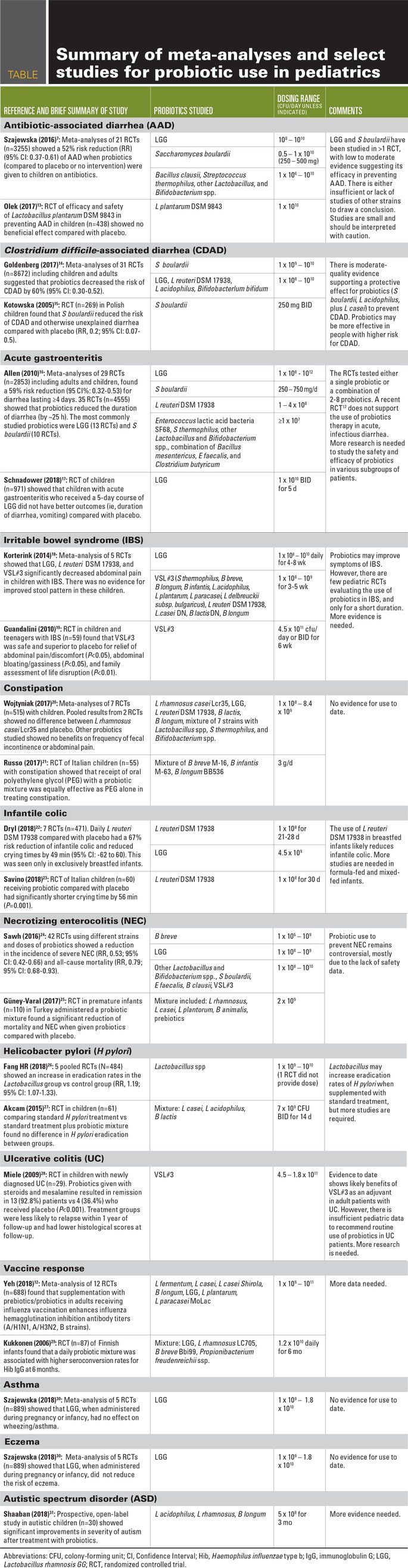 The Table provides a summary of selected meta-analyses and individual studies for probiotic use in various conditions in pediatrics.13-31