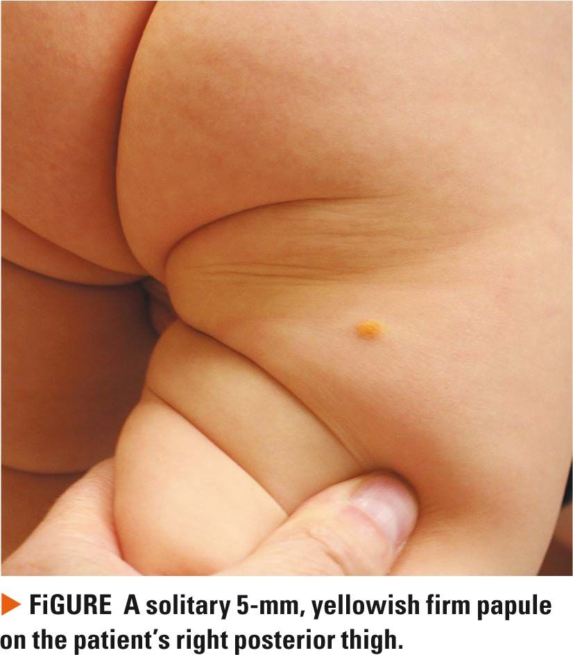 The parents of a healthy 5-month-old boy bring him to the office for evaluation of an enlarging yellowish nodule on the back of his right thigh. It started as a pink macule several months ago and became yellow and lumpy over the last month. The infant was born at term and has grown and developed normally. His parents deny any trauma, but report occasional bleeding from the surface of the nodule. They deny any new medications or outdoor exposures. There is no history of new topical skin products.
