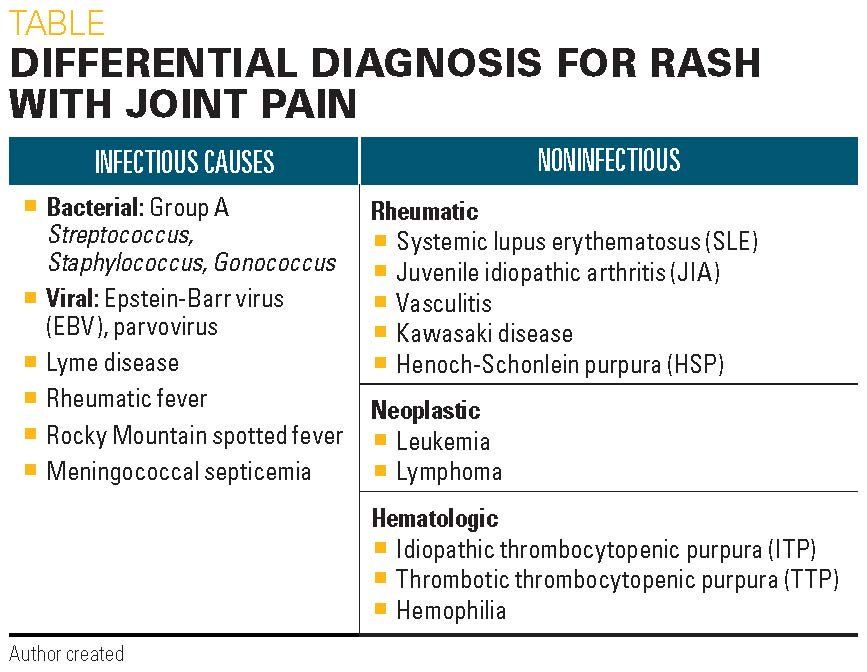 The differential diagnosis for rash with joint pain in children is broad and includes both infectious and noninfectious causes (Table). A detailed history with pertinent positives and negatives and a thorough exam is helpful in making the diagnosis. Some of the common differentials are discussed below.