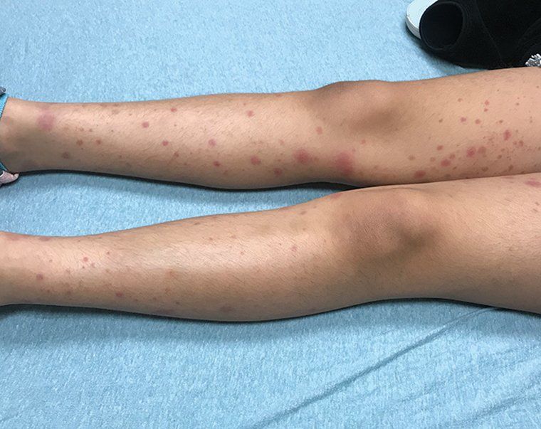 An 8-year-old, previously healthy girl presents to the emergency department (ED) with a rash “that looks likes bruises” and joint pain (Figure). Her mother reports that the rash started over her daughter’s lower legs a week earlier and has since spread to her thighs and buttocks. The red patchy rash is not painful and not pruritic. The girl denies new exposures to food or topical products, recent travel, camping, or recent injury.