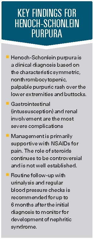 The use of steroids in patients with HSP is controversial. Whereas some studies have shown that early use of steroids decreases the duration of abdominal pain and prevents GI and renal complications, other studies have shown no difference.11,12 Immunosuppressive treatment and renal biopsy are reserved for patients with nephrotic range proteinuria and progressive renal impairment. An essential part of following patients with HSP is monitoring them for complications. An abdominal ultrasound is required for patients with new onset severe abdominal pain. Any change in mental status should prompt an evaluation for intracranial hemorrhage.