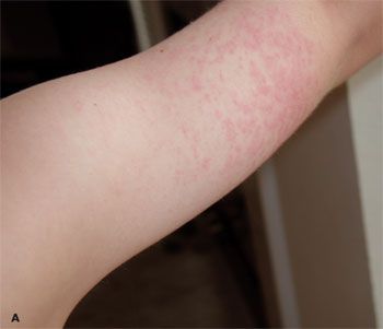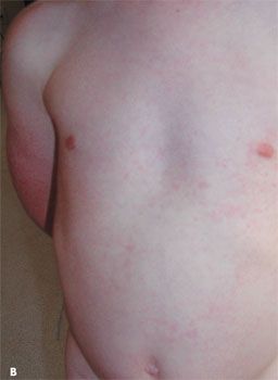 Figure 1 – The generalized maculopapular rash of erythema infectiosum develops on the neck, trunk, and extremities (A). As the rash fades, it has a lacy, reticular pattern (lesions on day 2, B).