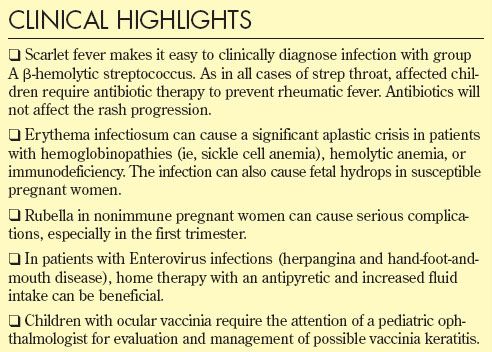 In the first 2 articles in this series (see Part 1 and Part 2), I focused on various classes of disorders in group 1: those that manifest with fever and petechiae or purpura, with fever and blanching rash, or with fever and vesicular or bullous lesions. Here, in part 3, I offer the last presentation of fever and rash requiring immediate attention-fever accompanied by pharyngitis and a "sandpaper" rash. I then go on to discuss the clearly recognizable viral syndromes that normally present with fever and rash; I describe the typical presentations and recommendations for initial management. Finally, I provide clues for differentiating the various viral infections characterized by umbilicated lesions.