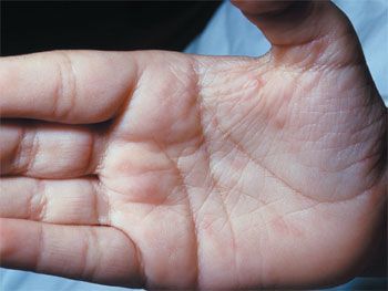 Figure 2 – These maculopapular lesions are characteristic of hand-footand-mouth disease. The rash appears on the hands and feet after a prodrome of low-grade fever, malaise, anorexia, and posterior pharyngeal ulcerations.