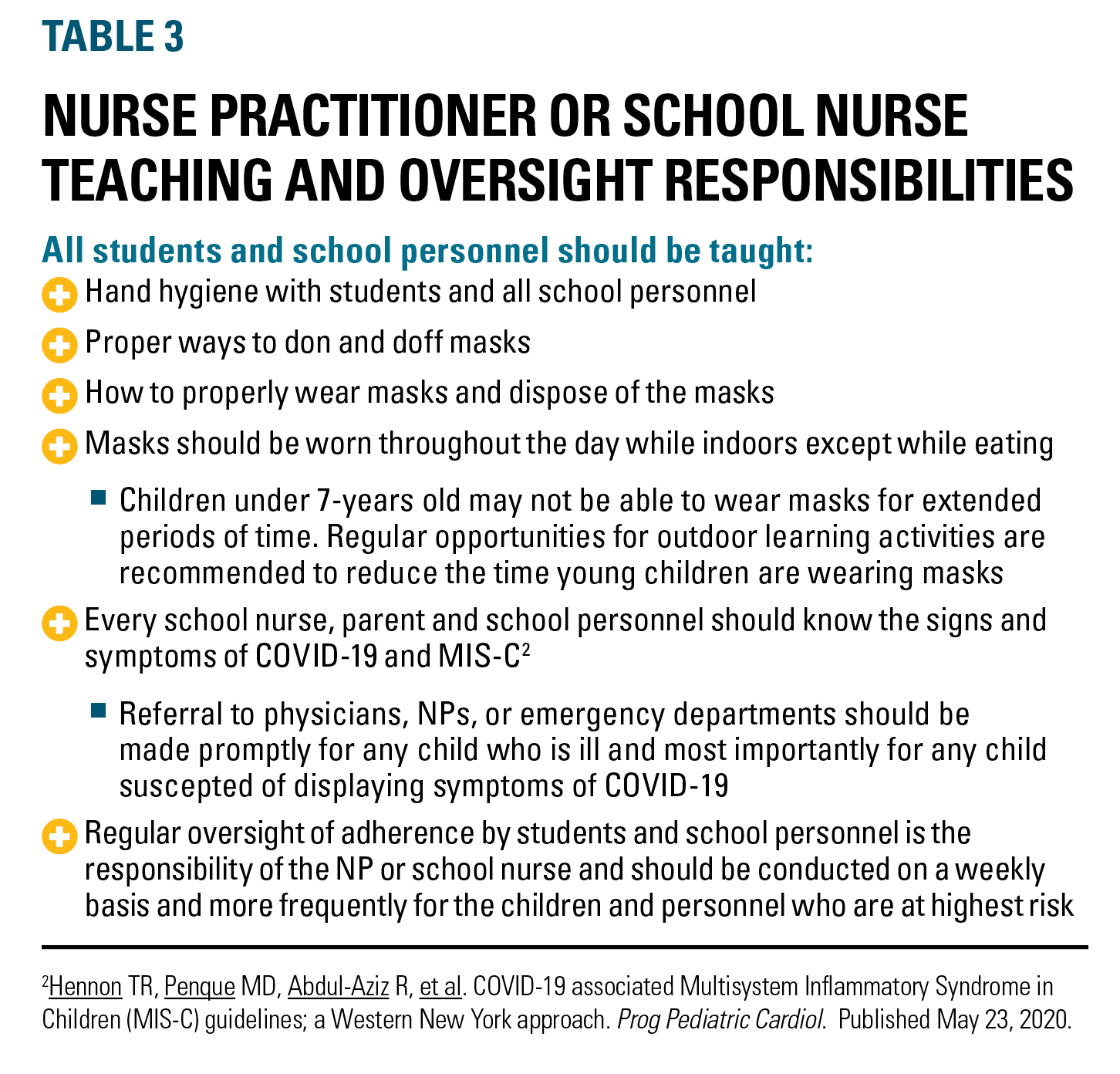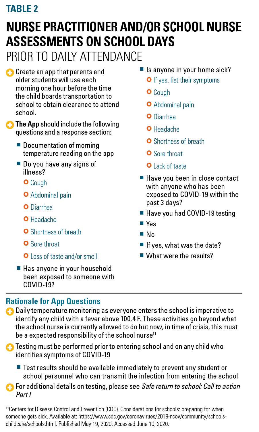 Planning, assessing, reassessing, and evaluation of potential problems are all critical components of return to school policies that focus on the health and well-being of the children and school personnel. In the COVID-19 pandemic, school nurses should be considered essential personnel for each school.13 Nurse practitioners or school nurses are needed to oversee implementation of public health initiatives to maintain a safe school environment (See Safe return to school: Call to action part 1). These initiatives include masks for all children and school personnel, monitor screening results before child enters school, and monitoring COVID-19 test results of children and school personnel. Management of ill children should be a top priority of every NP and school nurse.