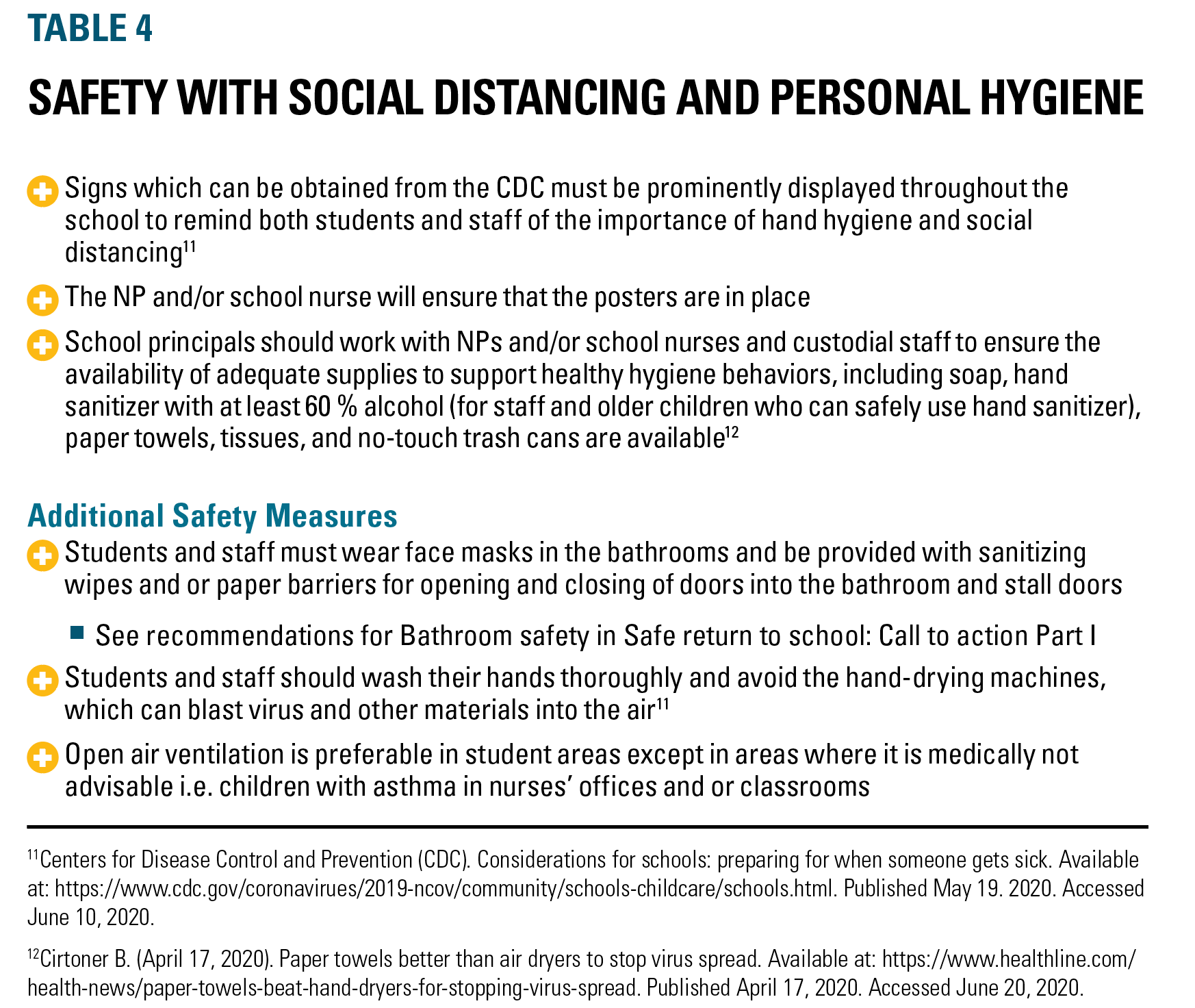 Nurse practitioners can conduct telehealth and telemedicine visits which are suitable for assessing the child’s physical status for return to school.9 Nurse practitioners in SBHCs can perform a physical assessment once school is in session for children who receive their care in SBHCs. For children who need immunization updates, NPs may offer ‘drive-in parking lot immunization updates’ prior to school openings. Parents can visit local pharmacies that offer on-site immunization updates. Children seen in private pediatric offices or community clinics can contact their providers to be seen at their practices sites. Guidance and best practices for NPs and school nurses to support the safety of students and staff return to school is presented in the following tables.