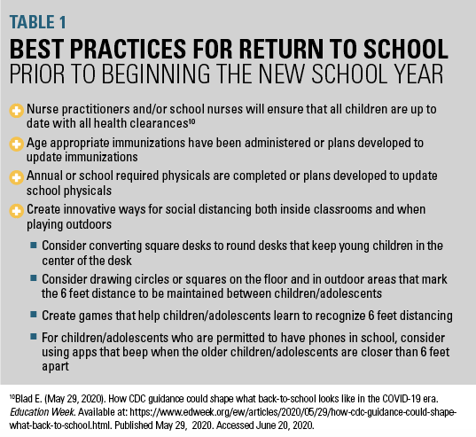 Acknowledgements: Based on the overall concern for the children we care for on a daily basis, five PNPs formed a ‘think tank’ engaging in weekly discussions on the preparation for return to school and authored two articles for this edition of Contemporary Pediatrics. In addition to the authors of this manuscript, significant contributors to this work were made by Regena Spratling, PhD, RN, APRN, CPNP, FAANP and Emily T. Cupelli, DNP, CPNP, BCB-PMD. Both are authors for the manuscript Safe return to school: Call to action, Part 1.
