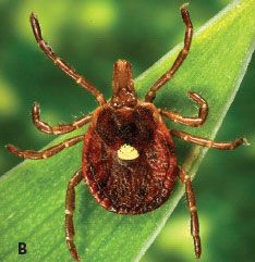 In early summer, an 8-year-old boy from rural central Virginia was brought for evaluation of a rash on his buttock (A). He had noticed the rash that morning, when it became pruritic. The father had removed a tick from the area about 10 days earlier. The child denied fever, headache, vomiting, fatigue, arthralgia, myalgia, and other symptoms.