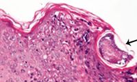 In scabies, the mite Sarcoptes scabiei infests the upper epidermis. Transmission occurs primarily by skin-to-skin contact and occasionally exposure to fomites. There is a resultant erythematous, papulovesicular rash, which may be accompanied by pathognomonic short, wavy, gray, linear mite burrows. Affected areas include axillae, volar wrists, interdigital skin, periumbilical skin, belt line, buttocks, thighs, male genitalia, and female nipple. Infants uniquely may have involvement of the scalp, face, neck, palms, and soles presenting as plaques, pustules, or pinkish-brown nodules.1