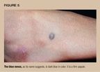The blue mole, also uncommon, is a firm, blue papule or nodule (Figure5). The microscope reveals many pigment cells deep in the dermis.