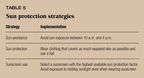 Exposure to ultraviolet rays is the one known external risk factor formelanoma that can be controlled, and sun protection does decrease melanomadevelopment in high-risk situations. Many people equate using sunscreenwith sun protection, however. This is unfortunate because intense sun exposureafter using sunscreen can offer more opportunity for ultraviolet injurythan a small amount of exposure without sunscreen.12 In additionto sunscreen, good sun protection includes avoiding sunlight by planningoutdoor activities before 10 a.m. and after 4 p.m. and wearing protectiveclothing and headgear (see Table 5).13