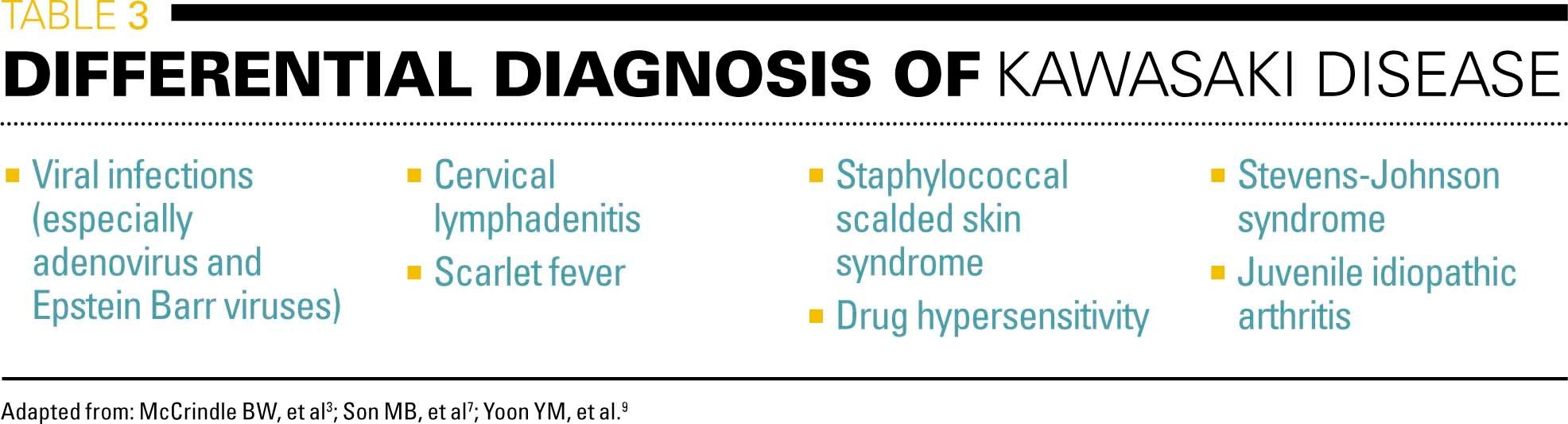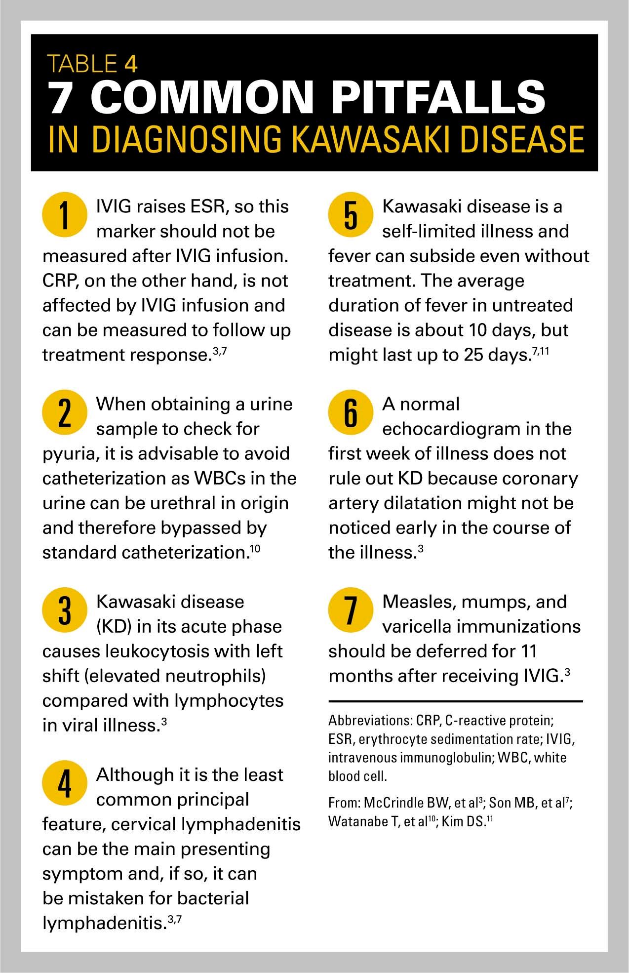 Other therapies include steroids, infliximab, and cyclosporine, but these usually are used in refractory cases and not routinely. Consultation with KD experts is always recommended in atypical or refractory cases.3,4,7 (See Table 4: Common pitfalls in diagnosing Kawasaki disease.)