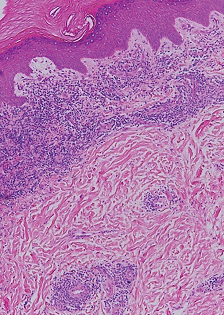Examination revealed erythematous-to-violaceous, edematous papules and small plaques on the dorsal feet with greatest density on the toes (Figure 1). Laboratory studies revealed positive ANA (1:320) with speckled pattern and normal CBC, erythrocyte sedimentation rate, C-reactive protein, C3, C4, anti-Smith, anti-double-stranded DNA, anti-Ro, and anti-La antibodies. Biopsy showed mild subepidermal edema with brisk perivascular and periadnexal lymphocytic infiltrate (Figure 2).