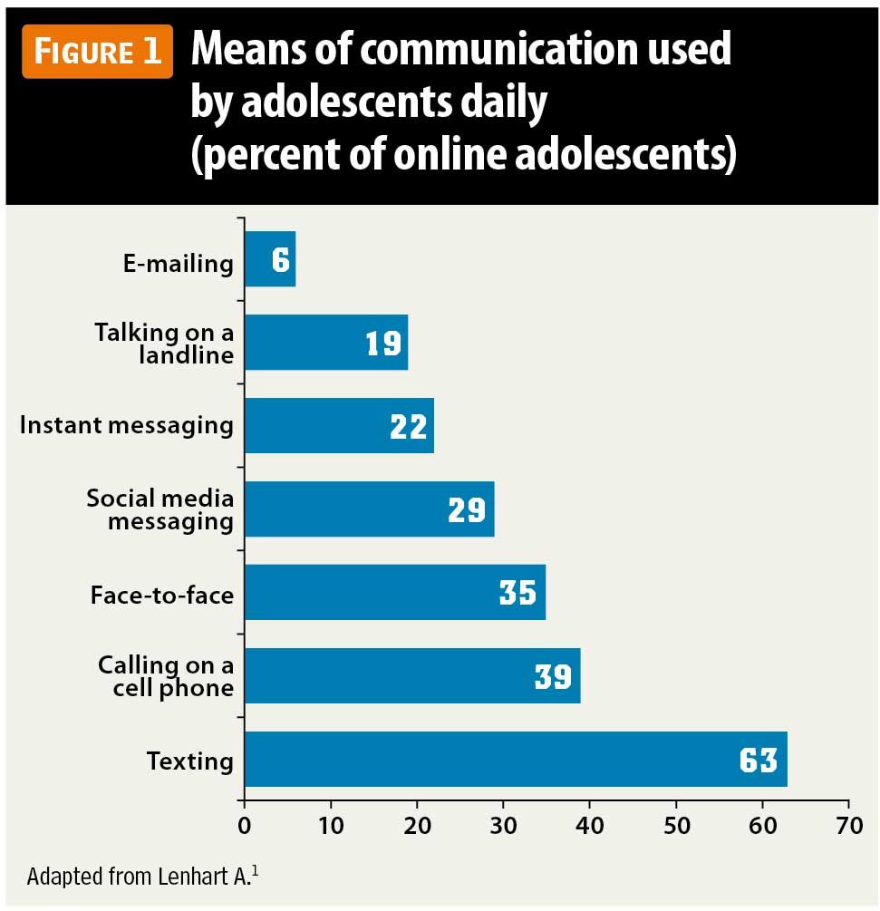 Mobile phones and texting-More than 75% of US adolescents own a cell phone, and teenagers are also the fastest-growing segment of smartphone owners in America.2,3 In a 2011 survey, 75% of US adolescents said they text regularly.1 Indeed, among teenagers who are online, their use of text messaging far surpasses the frequency of other forms of daily communication with their friends (Figure 1).1
