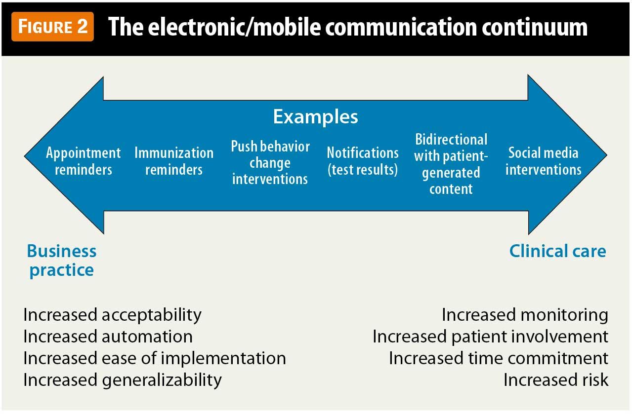 E-communication can be considered on a continuum ranging from uses focused on practice operations to those that are a more integral component of clinical care (Figure 2). Uses on the operational end of the spectrum require limited personnel oversight, are easily automated and scaled to include a large number of patients, and may be generalized to a variety of practice settings and for a range of issues (eg, immunization, screening test, and appointment reminders). These are typically provider-initiated messages sent without allowing free text responses from patients (although they may permit brief confirmation responses to indicate receipt and intent to keep the appointment). These uses may be more widely considered appropriate for direct contact with adolescents because the messages are less likely to include sensitive information and the message content is under provider control. However, more investigation is required to learn adolescents’ general preferences about receiving such messages.