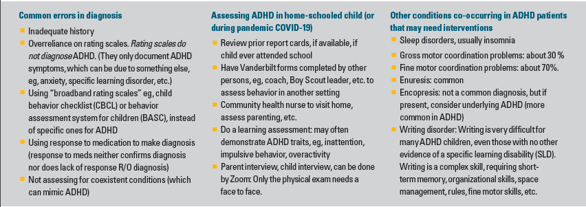 3. The evaluation for ADHD should include a screening process to rule out other comorbid conditions (see table) which can “mimic” the symptoms of ADHD, or be a coexistent condition. (Note: studies have shown that as many as 75% of children/adolescents diagnosed with ADHD fulfill criteria for another DSM-5 condition, such as specific learning disorder (SLD), anxiety, and/or depression, oppositional defiant disorder, etc. The term “ADHD Complex” is now being used to describe those children/adolescents.)