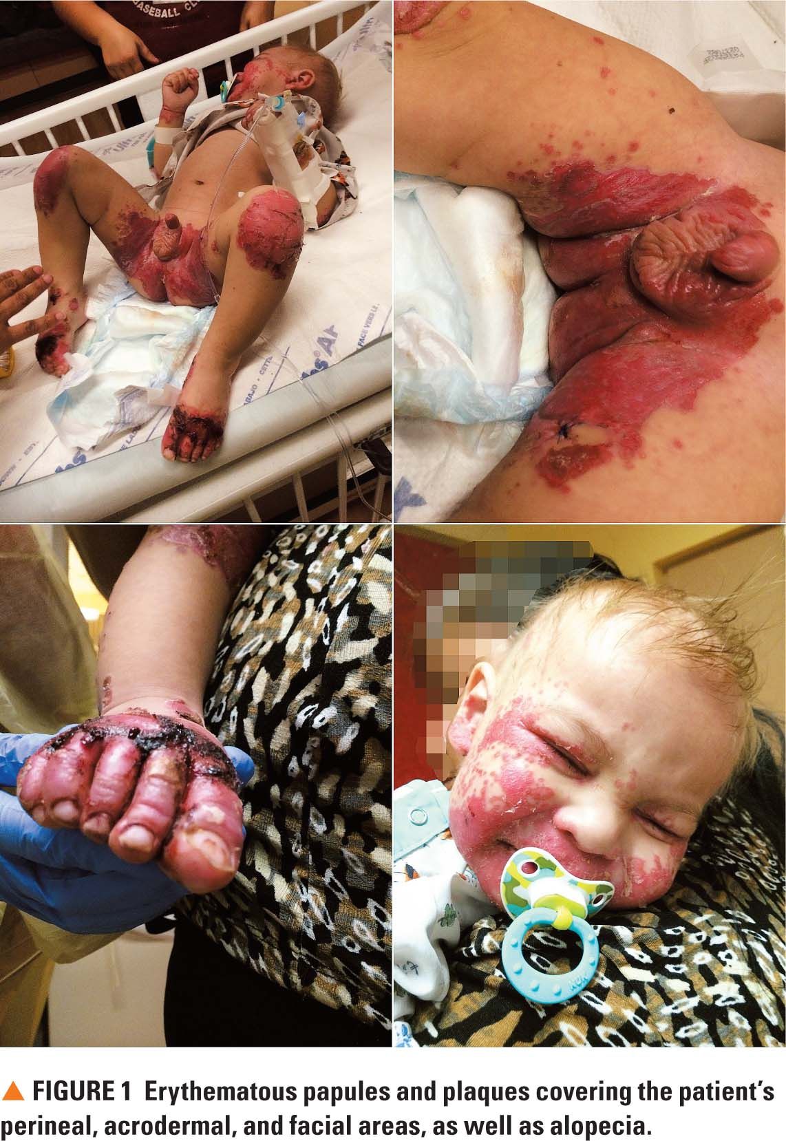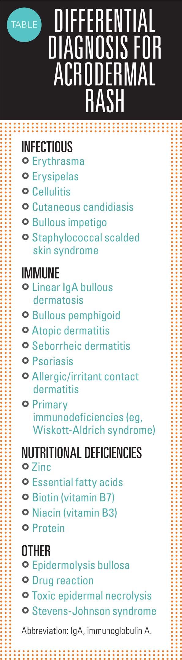 Finally, various nutritional deficiencies that can result in skin fragility, rash, hair loss, impaired immune function, and delayed developmental growth should be considered, including deficiencies in essential fatty acids, biotin, niacin, or zinc. Biotin is essential in carbohydrate and fatty acid metabolism. Symptoms of deficiency may include mental status changes, myalgias, anorexia, nausea, and red scaly dermatitis of the extremities. Both the rashes seen in biotin and essential fatty acid deficiency can result in skin changes similar to that of zinc deficiency. The patient’s varied diet made this an unlikely cause. Niacin deficiency can result in pellagra, a triad of photosensitive dermatitis in sun-exposed areas, diarrhea, and dementia. Given the patient’s rash in the perineal area, this also was unlikely.