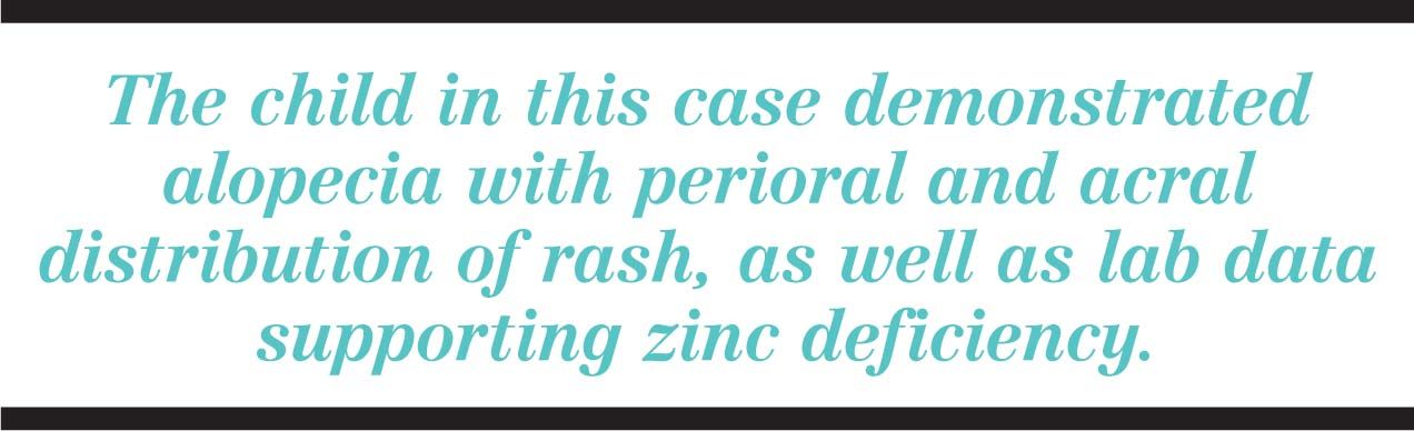 Symptomatic low levels of zinc also may be associated with a variety of other conditions. These include diseases with impaired intestinal absorption (Crohn disease, CF), increased urinary excretion (renal tubular defect in sickle cell disease, nephrotic syndrome), decreased binding capacity (hypoalbuminemia secondary to liver disease), or iatrogenic causes (inadequate supplementation in total parenteral nutrition [TPN]-dependent patients; those with decreased intake; or premature infants whose nutritional demands are greater than maternal supply).6,7 For zinc deficiency related to dietary intake, supplementation with 1-2 mg/kg/day of elemental zinc is generally sufficient; for deficits related to impaired zinc absorption, higher replacement doses (around 3mg/kg/day of elemental zinc) are generally required.8 Symptoms should resolve within 1 month of appropriate supplementation, as was seen in this patient. In patients whose symptoms do not respond within 1 month of initiation of therapy, it is important to consider the therapeutic level of treatment versus another underlying cause, such as malabsorption syndromes (eg, CF). These syndromes will only partially improve with supplementation, and will require addressing the primary defect, such as the utility of pancreatic enzyme replacement in CF.