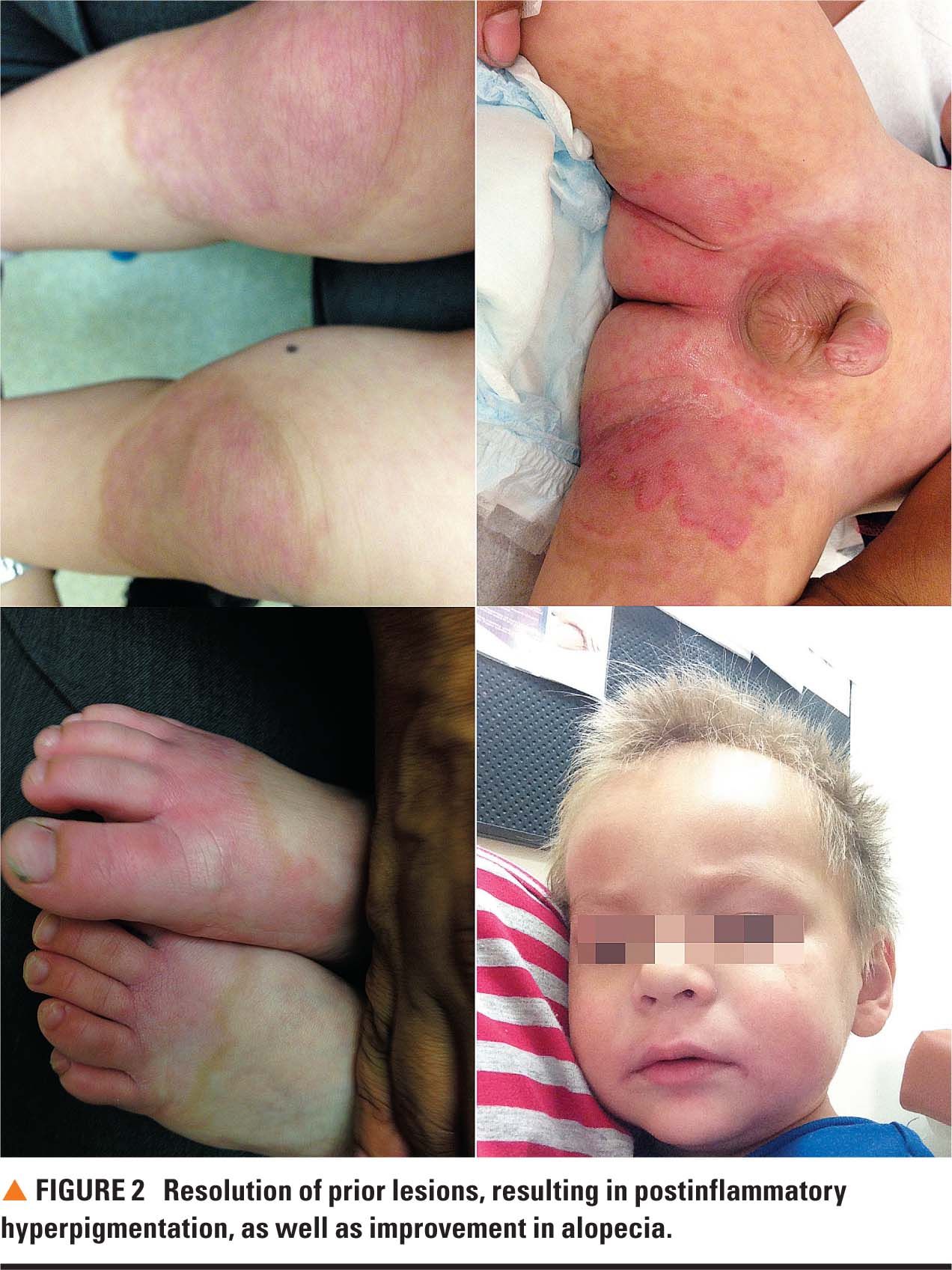 The patient was discharged home on oral clindamycin and topical mupirocin, and he was initiated on zinc acetate supplementation at 1.7 mg/kg/day. One month later, his rash had improved, but he continued to develop intermittent new vesicles. His zinc level was rechecked and remained low at less than 16 ug/dL. Zinc supplementation was increased to 4 mg/kg/day, which resulted in resolution of the rash and a normal serum zinc level after 1 month. With follow-up over the succeeding months, his alopecia began to resolve and no further lesions were noted (Figure 2).