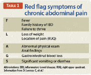 It is a busy day in the clinic. You enter your next exam room and meet a friendly 11-year-old white girl and her mother who recently moved to the area. The child explains that she has a long history of chronic, sharp abdominal pain without radiation to her flanks, back, or groin that lasts 2 to 3 days at least twice a month. It typically begins 15 to 30 minutes after eating breakfast and waxes and wanes throughout the day, improving by evening.