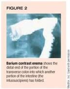 In children older than 2 years, any localized mass effect resulting from an intra-abdominal condition is more likely to become a lead point than in younger children. The list of diagnoses that can cause intussusception is almost limitless, therefore, and encompasses Meckel's diverticulum, a bowel wall hematoma secondary to blunt trauma, a hair ball (trichobezoar), and Henoch-Schönlein purpura. Intussusception also can be a postoperative complication.13 Table 1 lists conditions that have produced intussusception. Whatever the cause, the child's symptoms usually are indistinguishable from those of the infant with the "classic" form of intussusception, though the degree of pain, vomiting, and rectal bleeding varies. When adults develop intussusception, the lead point often is neoplastic.