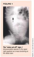 Plain film. As in the past, the first study is a plain film of the abdomen. Initial X-rays may be normal but as the intussusception progresses, a picture of small bowel obstruction without a localizing mass can be seen. A more distinctive pattern emerges when the intussusceptum crosses the hepatic flexure or is in the transverse colon: The lower margin of the liver, in the right upper quadrant, is lost or indistinct, and dilated loops of small bowel can be seen occupying the left half of the abdomen. In fewer than half of patients with intussusception, a "colon cut-off" sign can be seen as a distinct mass bordering on an otherwise normal distal colon (Figure 1). Free air on plain film indicates perforation and directly contraindicates further imaging procedures. Surgery should be performed immediately.