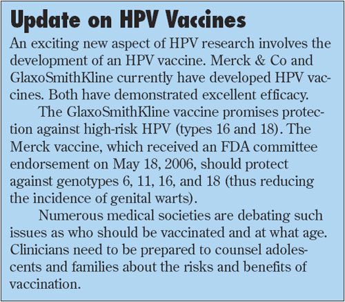 Up to 75% of all sexually active adolescents are infected with HPV. Male and female patients should be screened for genital warts during routine physical examinations. Sexually active females need counseling about the timing and initiation of Pap smear screening. In practice settings in which time or logistics preclude the performance of pelvic exams and Pap smears, it is prudent to develop solid working relationships with local gynecologists to whom patients can be referred for these evaluations.