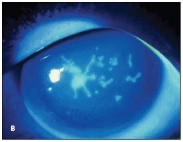 Wood lamp examination after fluorescein dye instillation revealed small branching lesions on both the cornea and conjunctiva, representative of herpes simplex conjunctivitis and keratitis. The girl was referred to ophthalmology. A conjunctival swab sent for herpes simplex virus (HSV) testing by fluorescent antibody revealed HSV type 1. This result was subsequently confirmed by viral culture.
