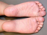 Juvenile palmar-plantar dermatosis (JPD), sometimes referred to as "sweaty sock syndrome," is a common dermatosis of infancy and childhood characterized by asymptomatic symmetrical, red, glazed, smooth appearance of the anterior surface of the soles and sometimes the palms.1 The dermatitis usually develops in the late fall or winter and involves primarily the distal aspects of the soles and toes, with sparing of the interdigital spaces.1,2 The pink, scaly patches may crack and fissure and disrupt normal epidermal skin markings.1 Although most eruptions are not symptomatic, cracking and fissuring can cause pain with movement and secondary infection occurs occasionally.