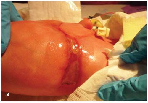 The primary treatment goal is prevention of fatal complications, such as bleeding, sepsis, and possible traumatic perforation or peritonitis secondary to bacterial invasion of large skin and muscle defects of the abdominal region.7 Management may be conservative, surgical, or a combination of both. Large defects may require skin grafting or even local flaps. Less severe defects may be treated with topical silver sulfadiazine or mupirocin and an antibacterial dressing that resists scar drying and separation and allows epithelialization.8