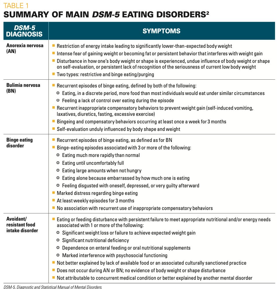 The Diagnostic and Statistical Manual of Mental Disorders (DSM-5) defines 4 categories of eating disorders: AN, bulimia nervosa (BN), binge eating disorder (BED), and avoidant/ restrictive food intake disorder, along with several noted as “other” or “atypical disorders.”2 Table 12 summarizes the diagnostic criteria for these categories. Body weight is among the diagnostic criteria for AN only; these patients may be underweight, within normal range, or overweight.