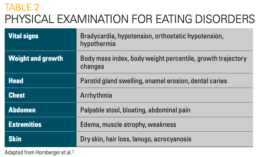 Education can start during the screening interview: “Here’s what concerns me when you tell me these things. You’re taking in less energy than your body is expending, and that’s affecting your physical health. Your blood pressure is low. I’m worried that you could pass out while you’re playing your sport or driving.” Sharing weight numbers or commenting on the patient’s thinness may backfire because the patient is likely to view alarming weight loss as a positive development.