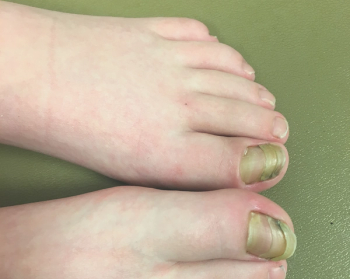 A 13-year-old girl presents with great toenails have become yellow, thickened, ridged, and crusted proximally on the left over the last 8 months.