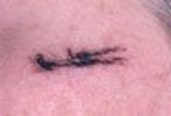 This asymptomatic swelling above a 3-month-old boy's left eyebrow had not changed since birth. The 15 × 13-mm, soft, nontender, freely mobile nodule had no punctum, hair tuft, or other skin anomaly. The infant was born at term and was otherwise healthy. At the parents' request, the nodule was excised without complications by a pediatric surgeon. Pathological findings showed lamellated keratin within the mass and surrounding pilosebaceous units opening into the mass, consistent with a dermoid cyst.