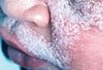 A healthy term infant born via normal vaginal delivery was noted at birth to have numerous small vesicles involving most of his face and upper chest. He was transferred to the neonatal ICU for suspicion of disseminated herpes simplex. On examination, the infant had small, 1- to 2-mm, superficial, clear vesicles that were confluent on the forehead, eyelids, nose, cheeks, neck, and upper back. A Tzanck test was negative for multinucleated giant cells.