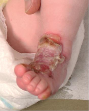 You are called to the hospital nursery to evaluate a healthy full-term newborn boy who developed painful flaccid blisters and erosions on the tops of his feet and ankles shortly after birth. His mother had a history of similar recurrent skin lesions that healed with scarring. She also had oral and gastrointestinal tract involvement. What's the diagnosis?