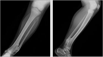 An apparently healthy 9-year-old girl noted to have left ankle mass during well-child checkup. Her last well-child visit was 3 years earlier. Medical history unremarkable. She denied fevers, weight loss, night sweats, and chills. No family history of bone deformities or growth disturbances.