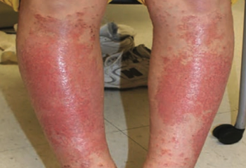 A healthy 14-year old boy was evaluated for an intensely pruritic shin rash that developed 2 weeks prior and had been treated with oral antibiotics for 10 days.